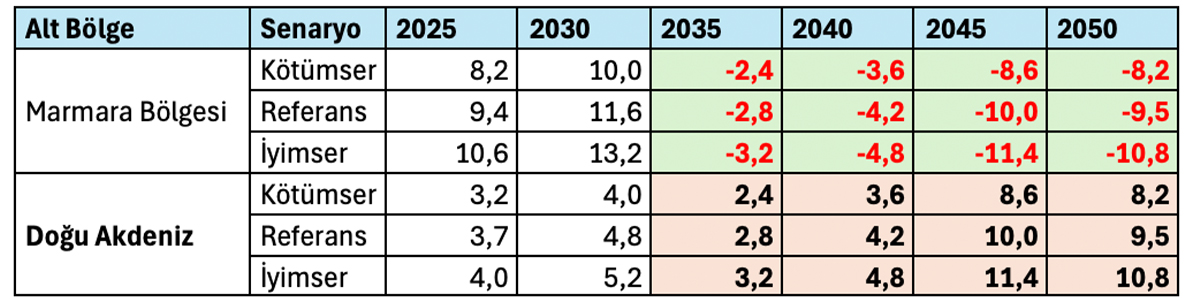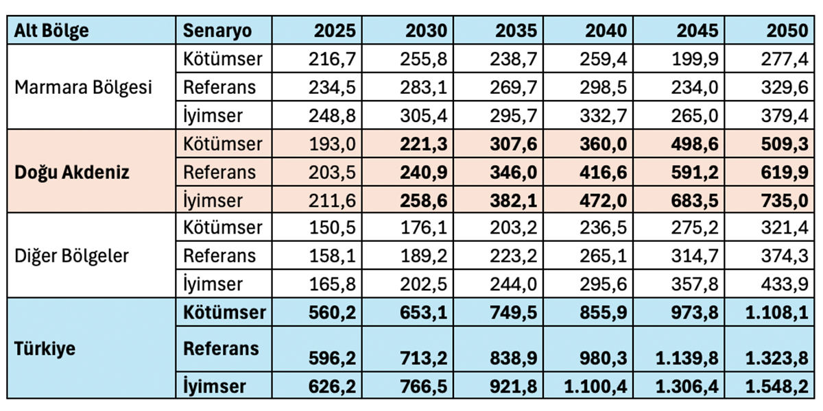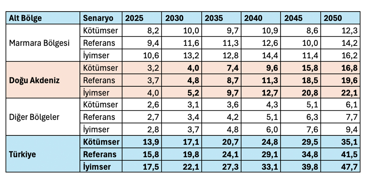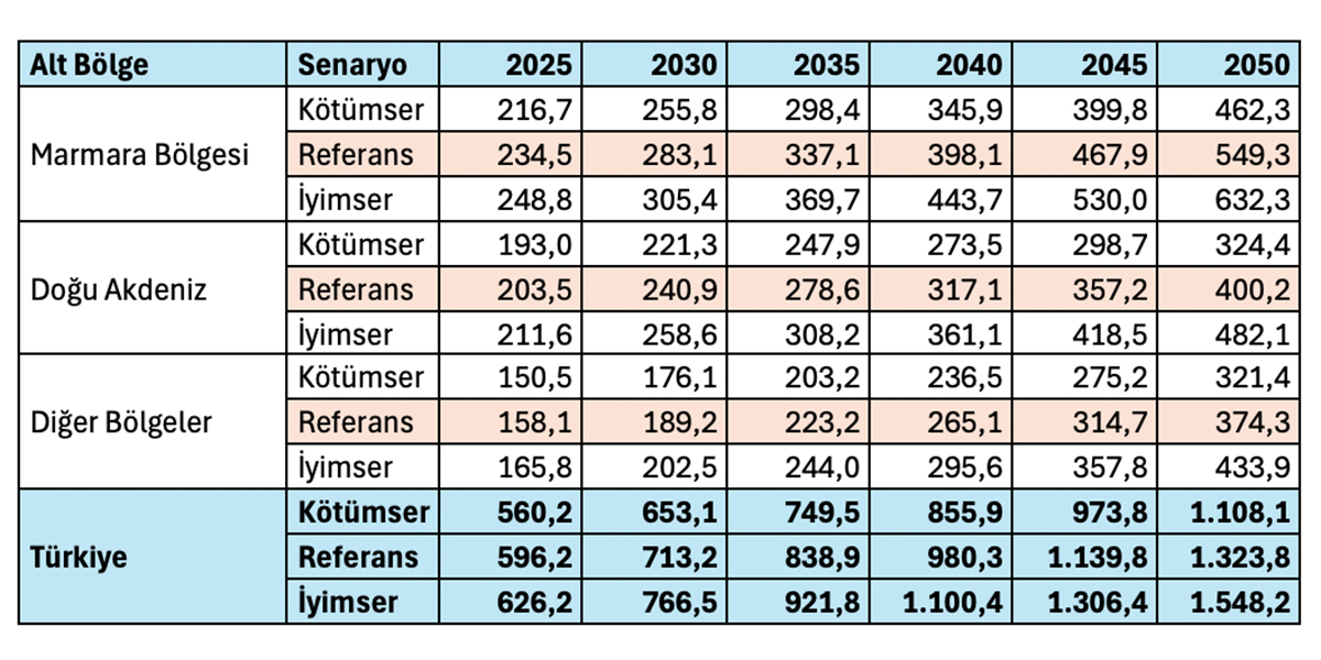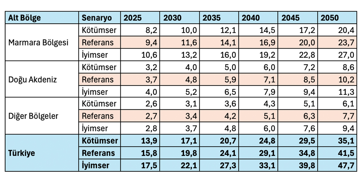 Referans senaryoda 2035 yılında 67,4 milyon tondan 2050 yılında 219,7 milyon tona çıkmaktadır.