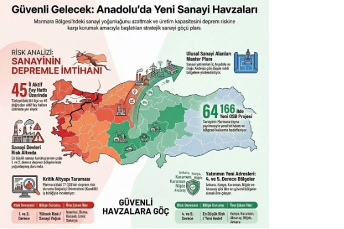 Sanayi ve Teknoloji Bakanlığı tarafından hazırlanan “Ulusal Sanayi Alanları Master Planı” ile başta İstanbul ve çevresi olmak üzere Marmara Denizi çevresindeki büyük metropollerde ve afet riski yüksek bölgelerde yoğunlaşan sanayinin Marmara Bölgesi dışına taşınması ve ülke genelinde dengeli bir dağılımın sağlanması amacıyla yeni bir planlama sürecinin başlatıldığı kamuoyuna açıklanmıştır. İlgili bakanlığın koordinasyonunda 14 ilde yeni sanayi havzalarının kurulmasının planlandığı, böylelikle sanayinin Anadolu’ya dengeli şekilde yayılmasıyla planlı şekilde çok büyük ölçekli bir “Sanayi Göçü” de hedeflenmektedir. 1