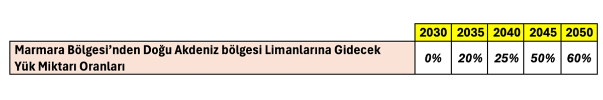 Bu tahminde Marmara Bölgesi’nden Doğu Akdeniz bölgesine kayacak Toplam Yük ve Konteyner miktarlarının düşüş oranlarının yıllar bazında; 2035 için %20, 2040 için %25, 2045 için %50 ve 2050 için %60 olarak öngörülmüştür. Aynı şekilde Marmara’da azalan oranlardaki artışlar diğer liman bölgelerinin yük tahminlerine ilave edilmektedir.