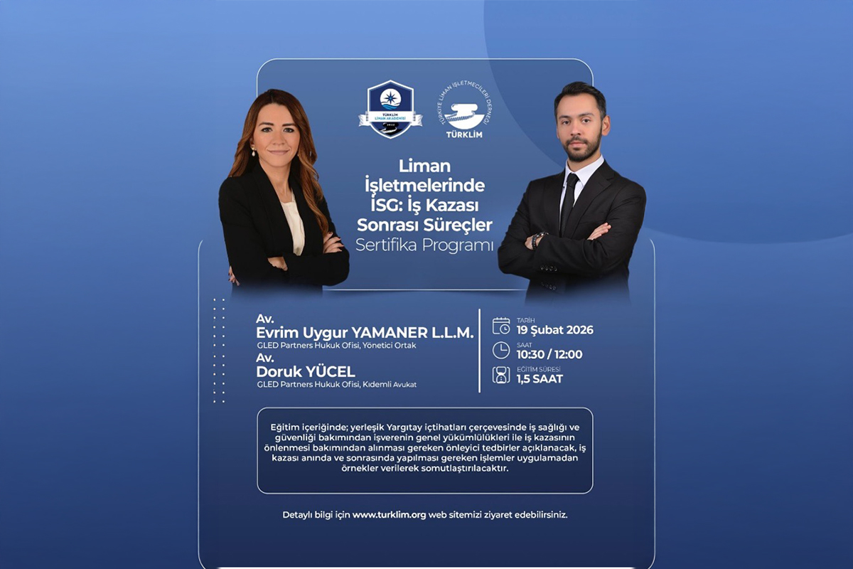 19 Şubat 2026 tarihinde, TÜRKLİM Liman Akademisi tarafından düzenlenen “Liman İşletmelerinde İş Sağlığı ve Güvenliği Bakımından İşverenin Genel Yükümlülükleri ile İş Kazasından Sonra Yapılması Gereken İşlemlerin Yerleşik İçtihatlar Çerçevesinde Değerlendirilmesi” konulu eğitim, Av. Evrim Uygur Yamaner, LL.M. (GLED Partners Hukuk Ofisi, Yönetici Ortak) ve Av. Doruk Yücel (GLED Partners Hukuk Ofisi, Kıdemli Avukat) eğitmenliğinde gerçekleştirilmiştir.